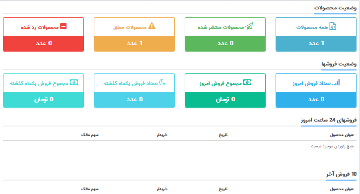 وضعیت فروشها: در اینجا می توانید وضعیت فروش محصولات خود در بازه زمانی 24 ساعت و یک ماهه مشاهده نمایید